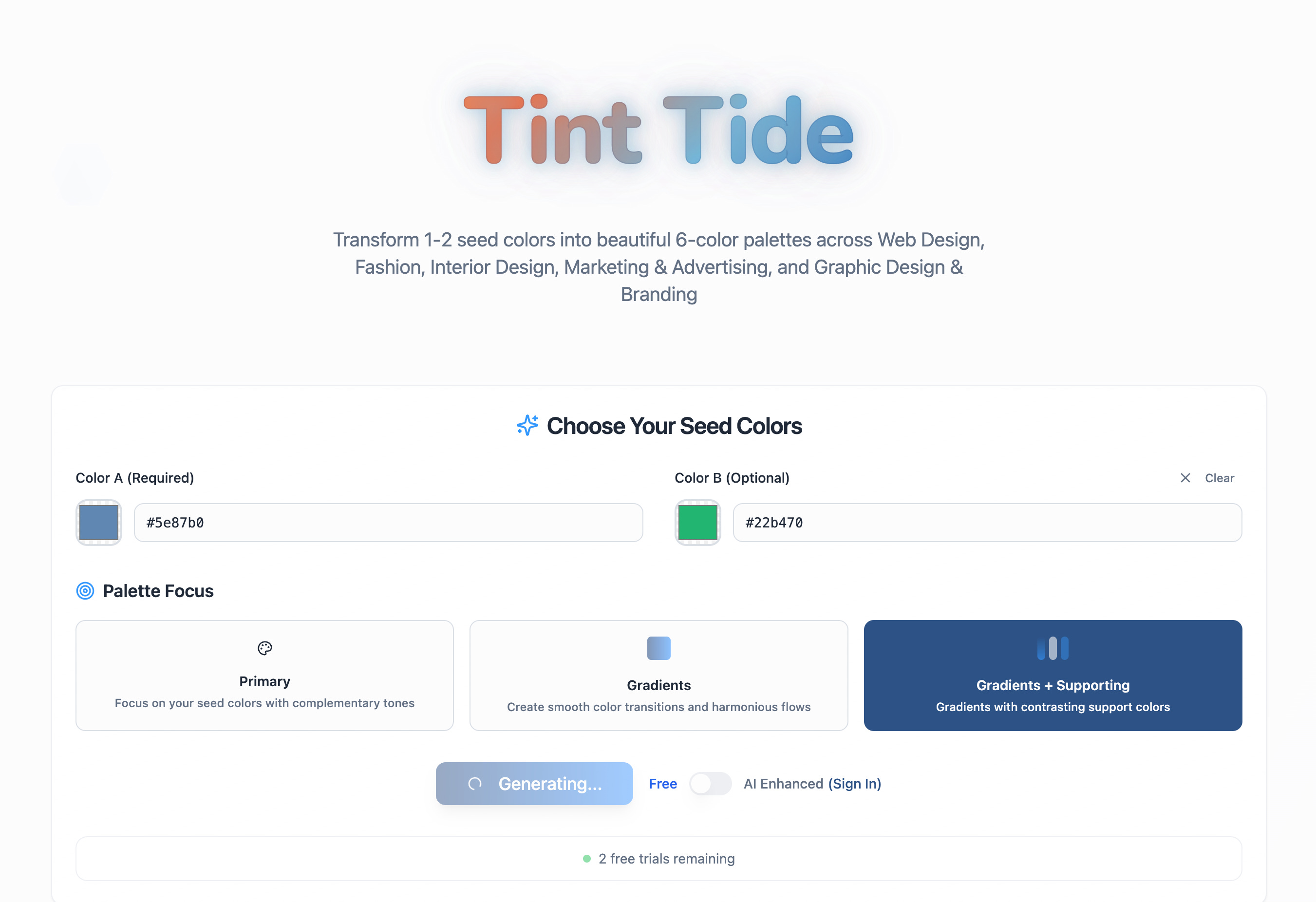 Tint Tide is an AI-powered color palette generator built for designers, developers, and creative teams who need production-ready palettes without the guesswork. Whether you’re launching a new brand, building a web app, or curating a mood board, Tint Tide delivers harmonious color combinations in seconds — palettes that feel intentional, cohesive, and immediately usable.